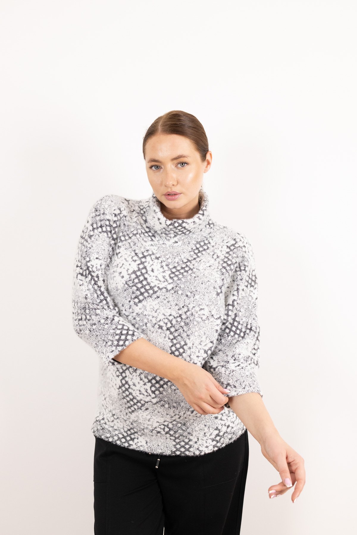Balıkçı Yaka Detay Taş Baskı Desenli Kazak