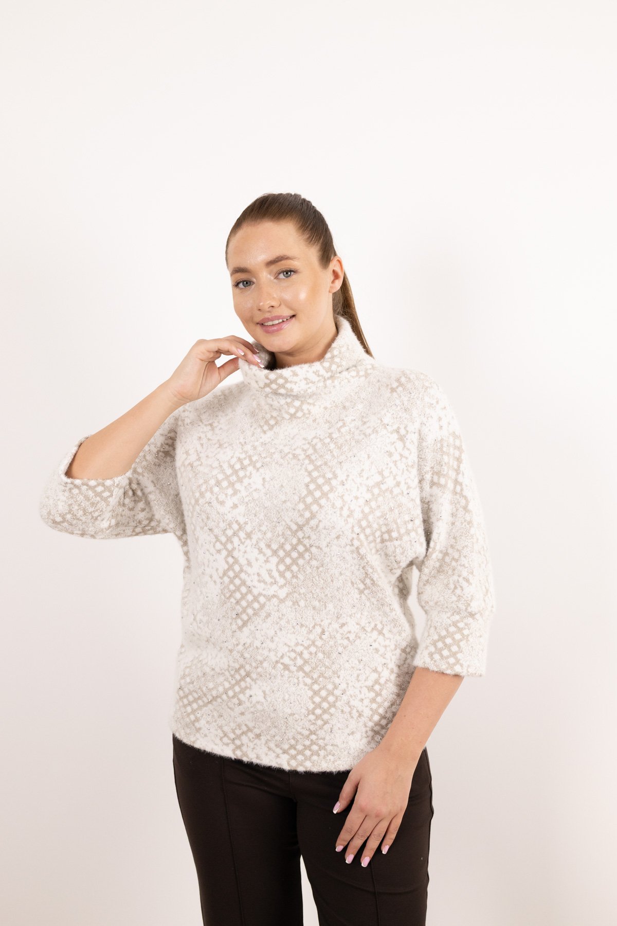 Balıkçı Yaka Detay Taş Baskı Desenli Kazak