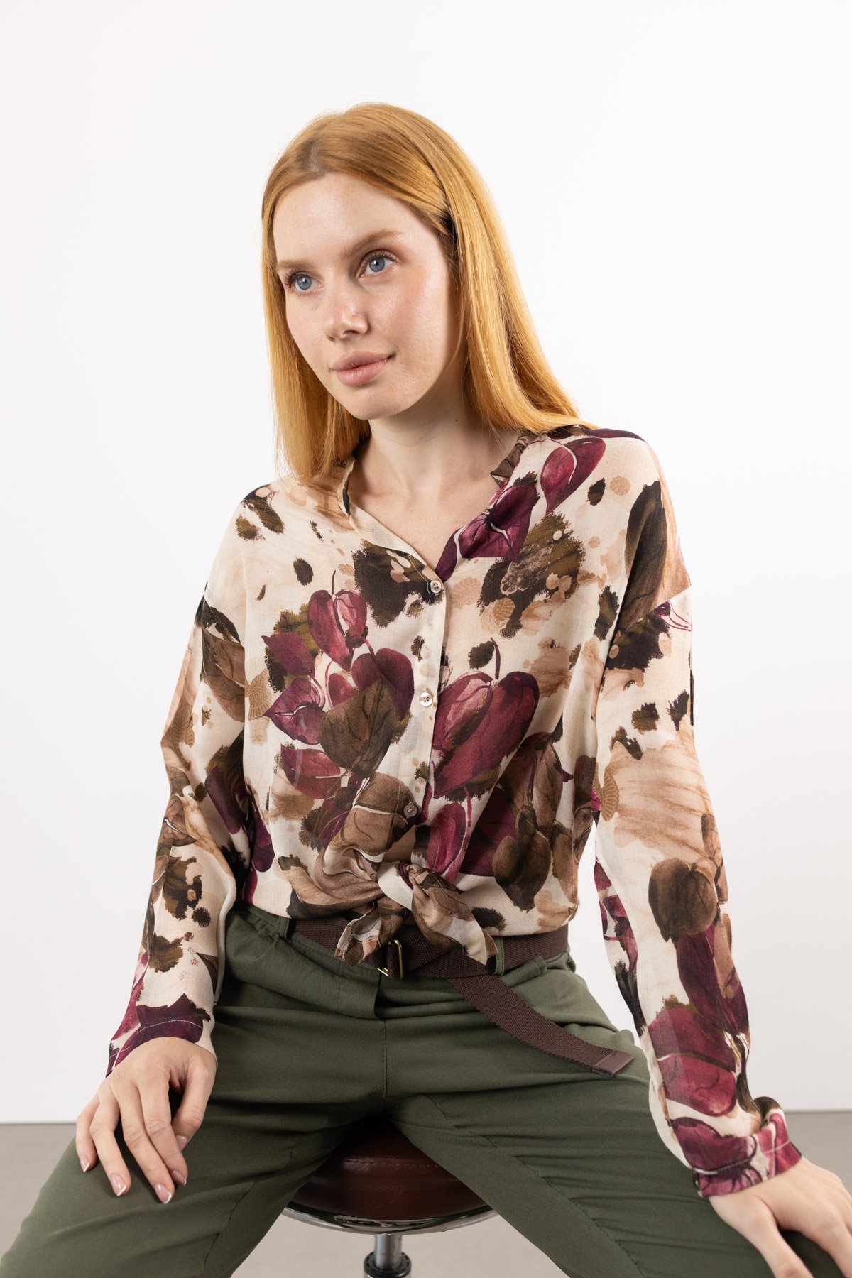 Bel Bağlama Detaylı Yaprak Desenli Gömlek