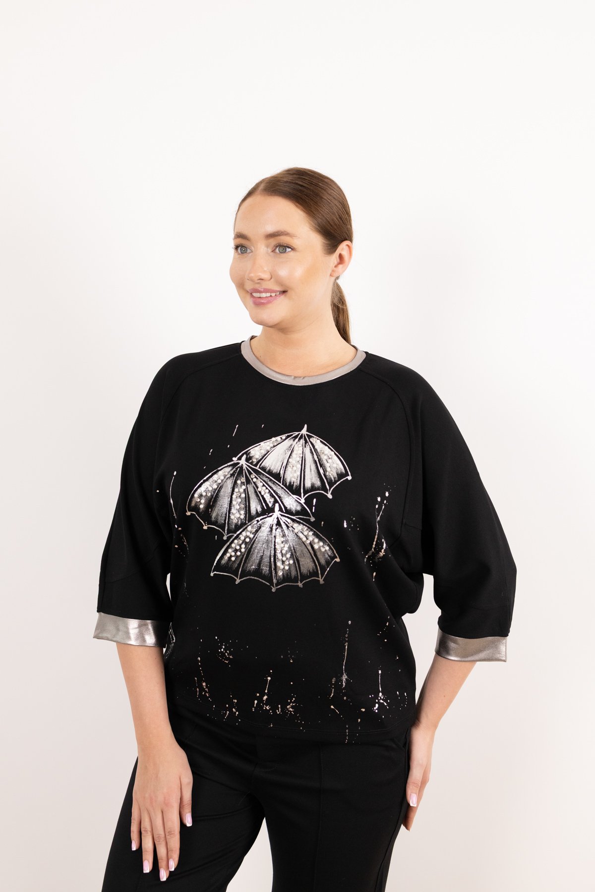 Bisiklet Yaka Detaylı Şemsiye Baskılı Boncuk İşlemeli Bluz