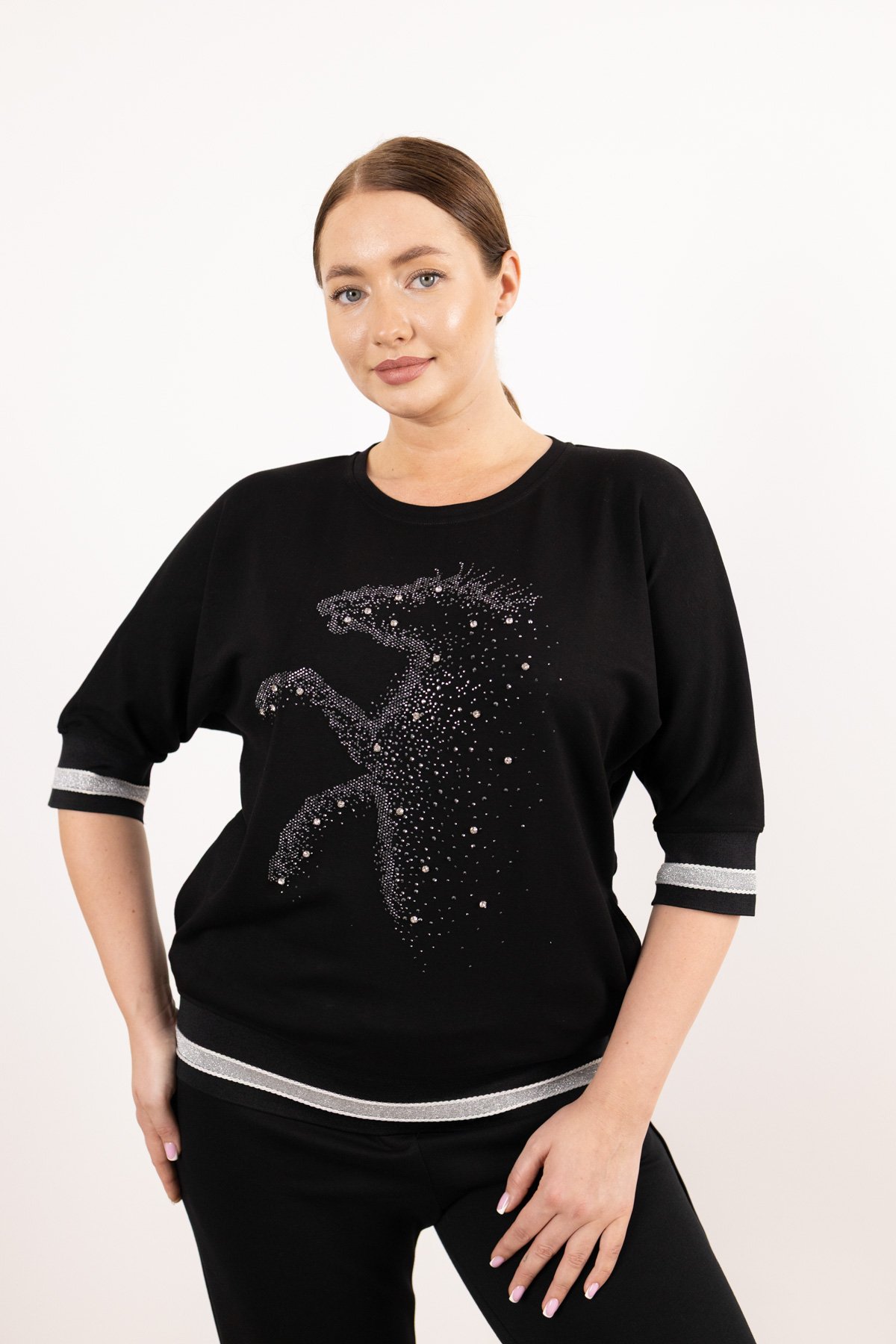 Bisiklet Yaka Detaylı Taş At Baskılı Kısa Kollu Bluz