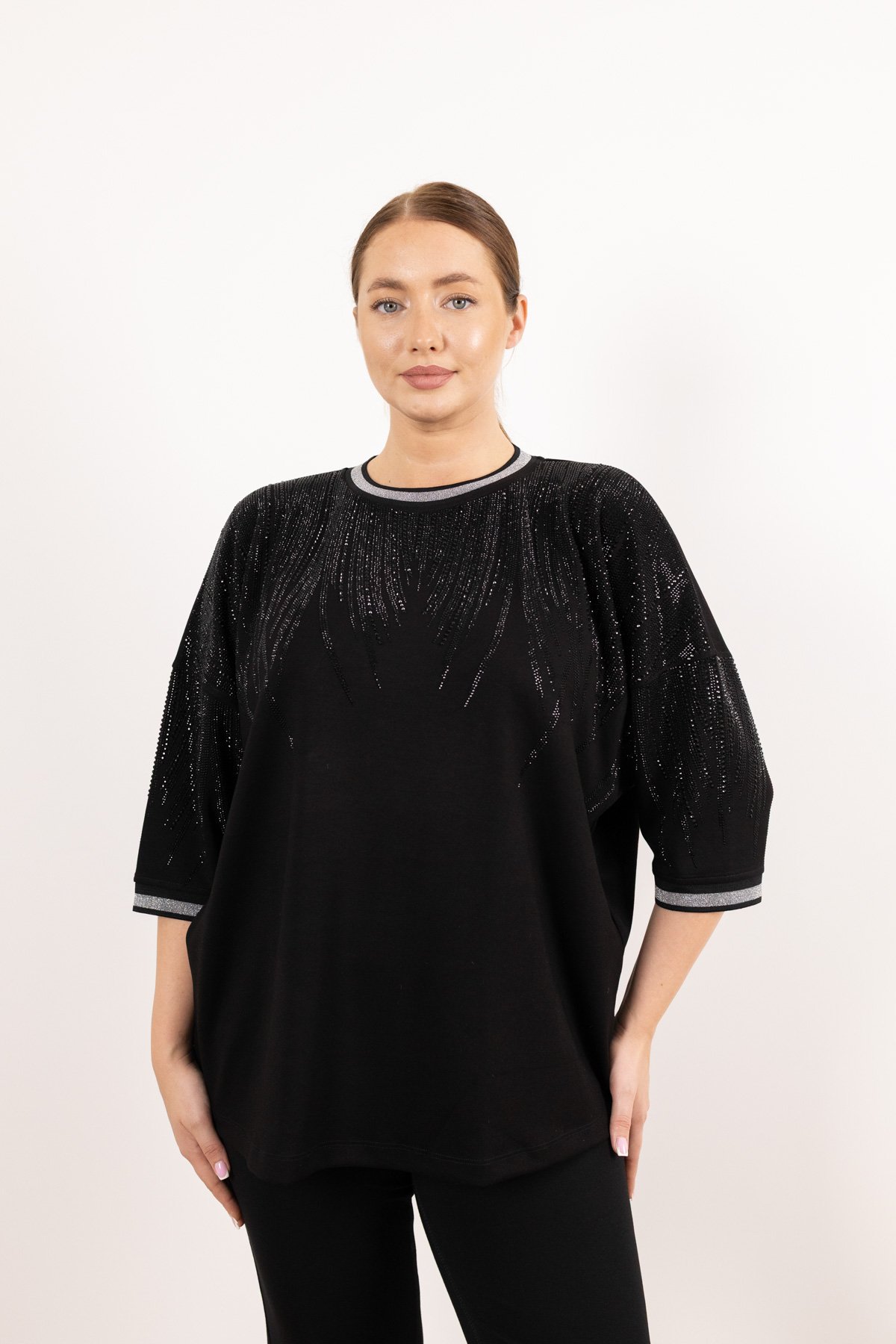 Bisiklet Yaka Detaylı Taş Baskılı Kolları Taşlı Bluz