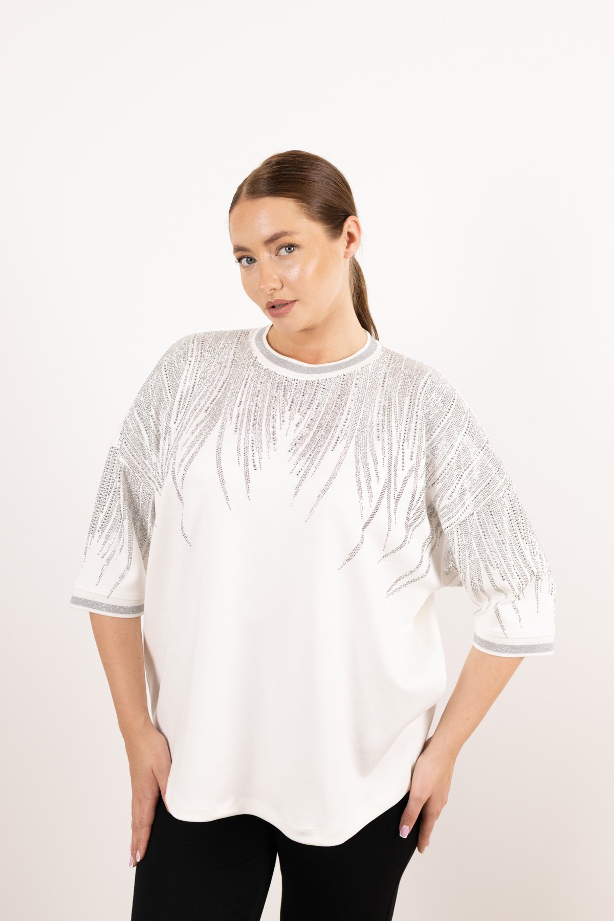 Bisiklet Yaka Detaylı Taş Baskılı Kolları Taşlı Bluz