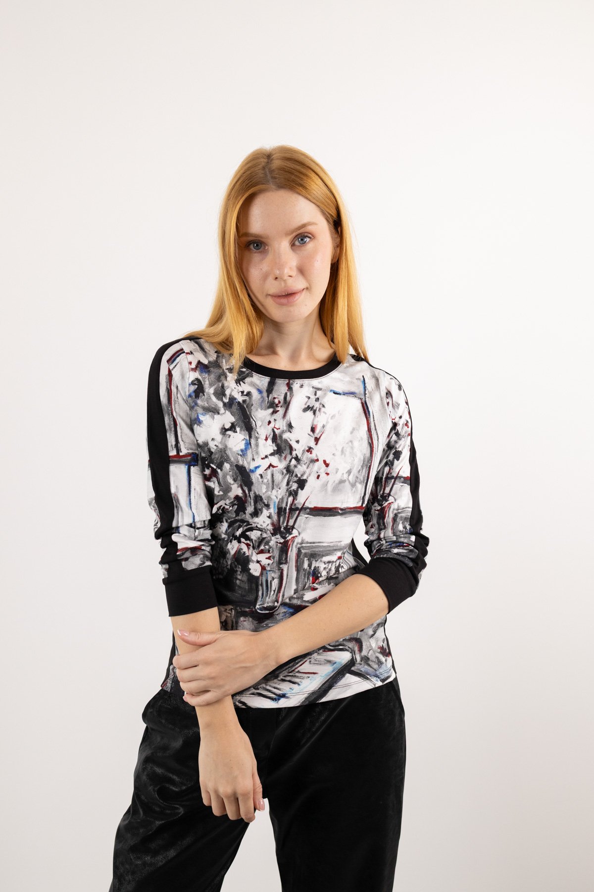 Bisiklet Yaka Detaylı Taş Baskılı Vazo Desenli Bluz (33K6BLZ7569063)
