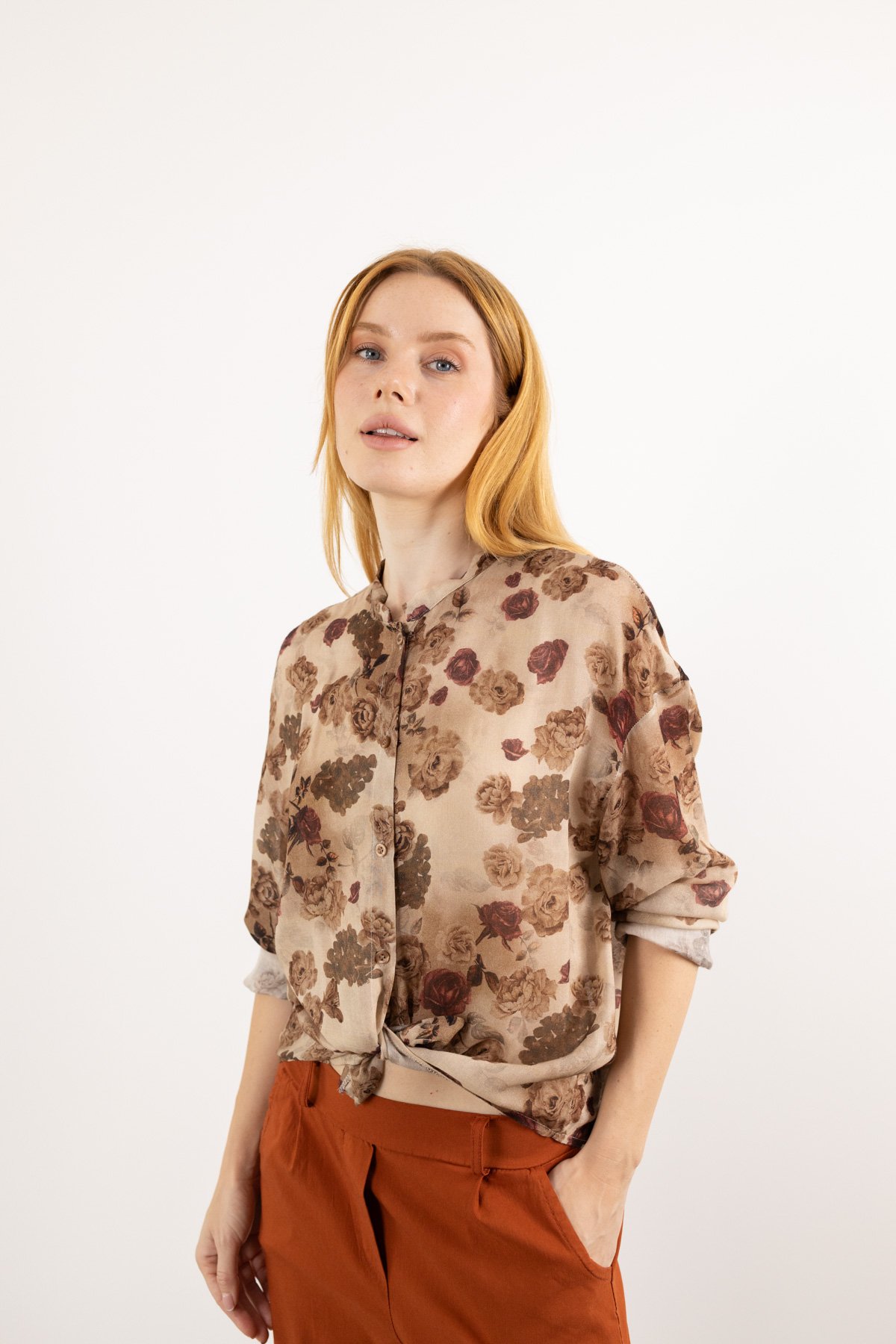 Gül Desen Detaylı Bel Bağlamalı Gömlek