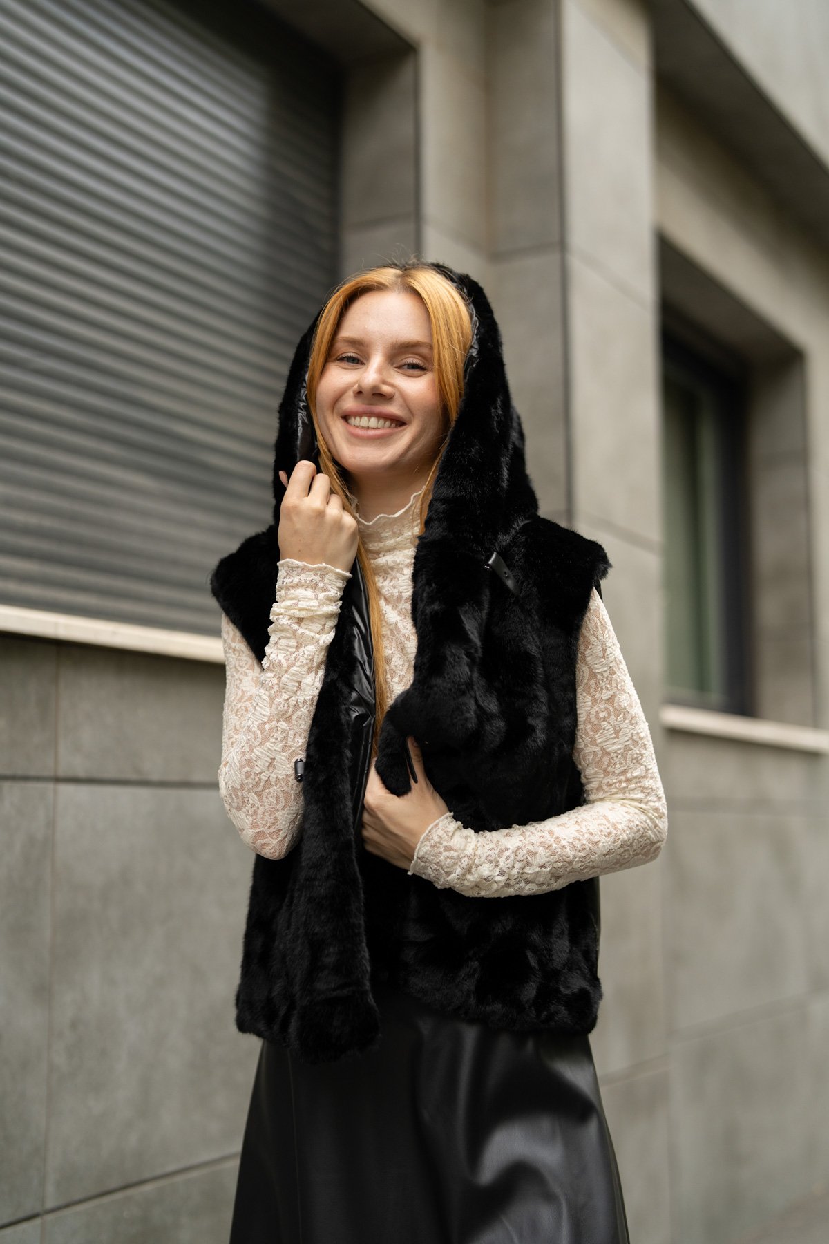 Kapüşon Detaylı Kürk Detaylı Kısa Kollu Yelek