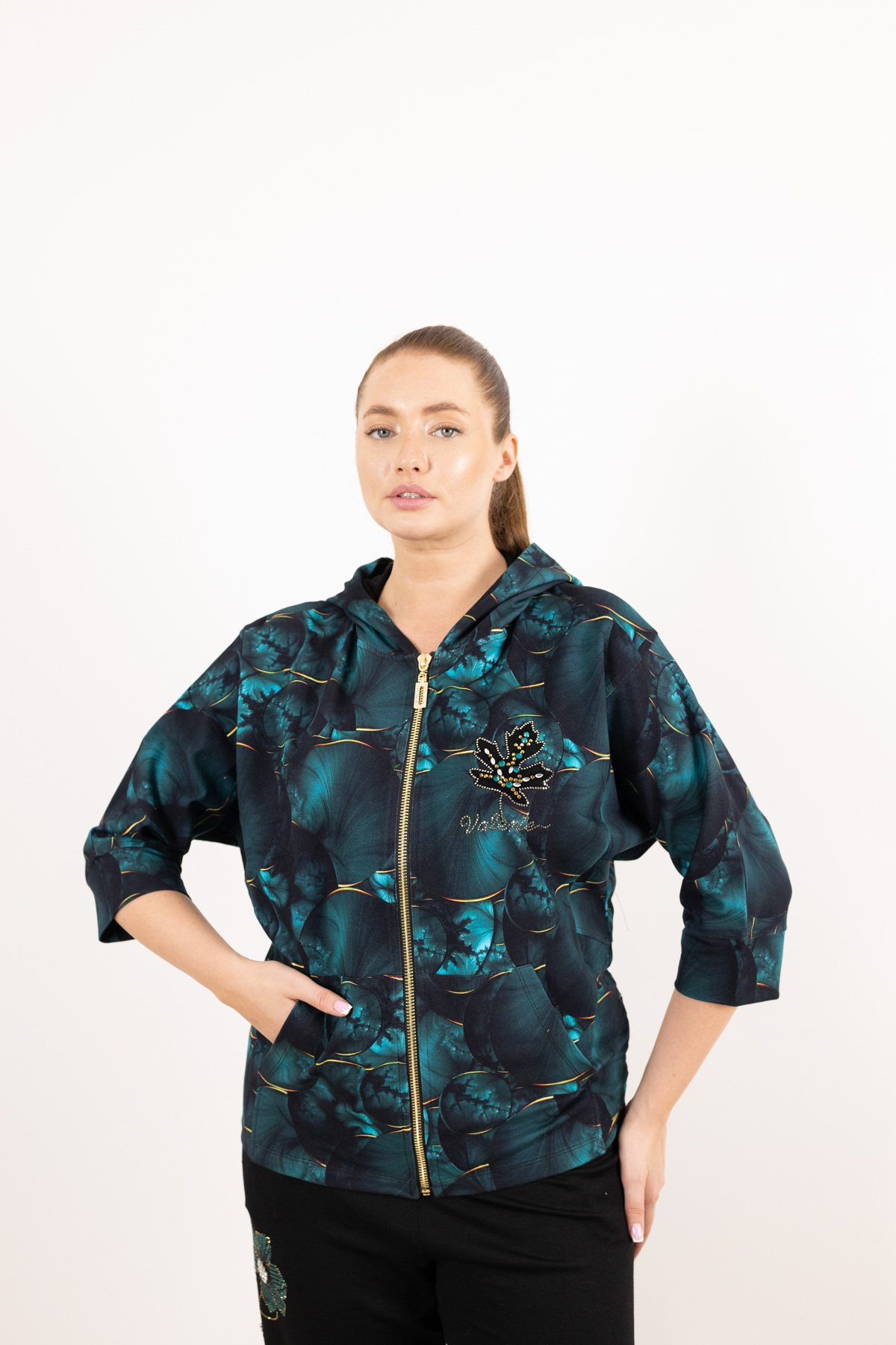Kapüşon Detaylı Yaprak Taş Baskılı Desenli Hırka