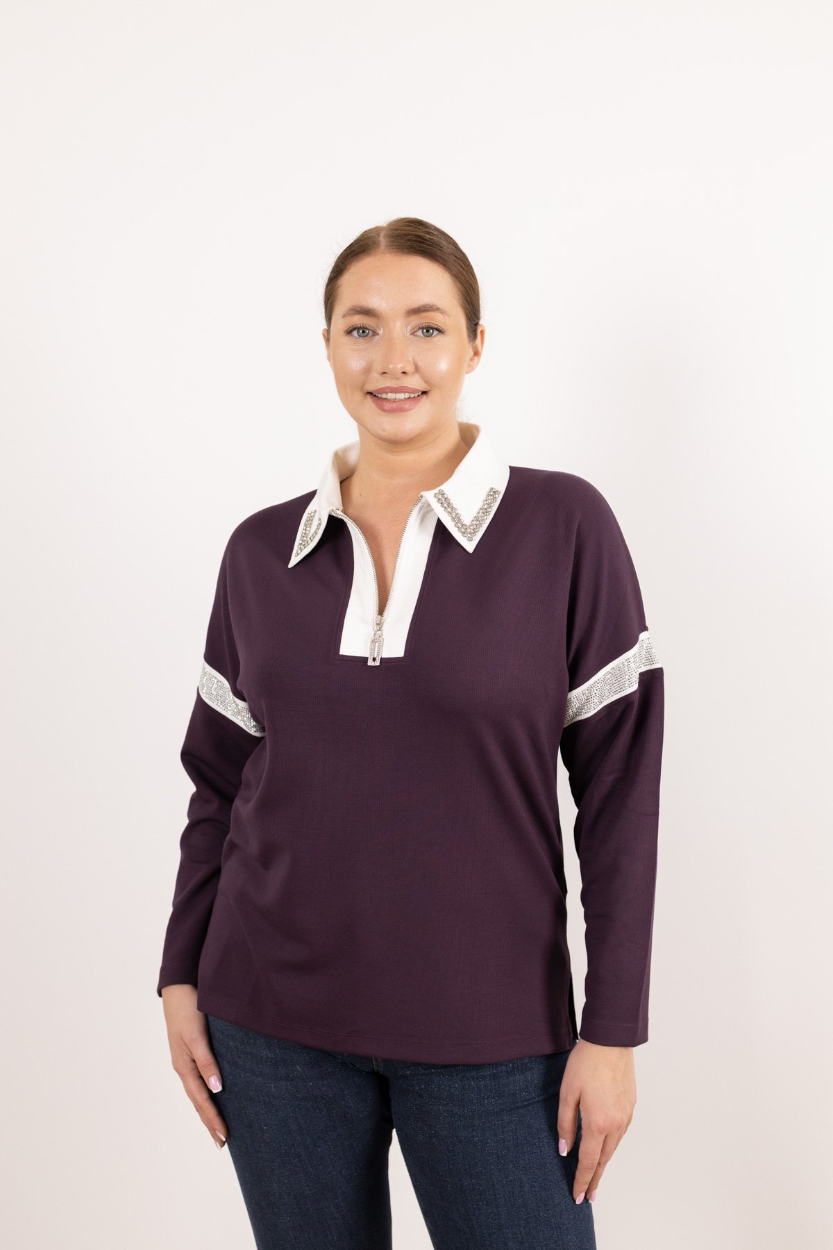 Polo Yaka Detaylı Fermuar VeTaş Baskı Desenli Bluz