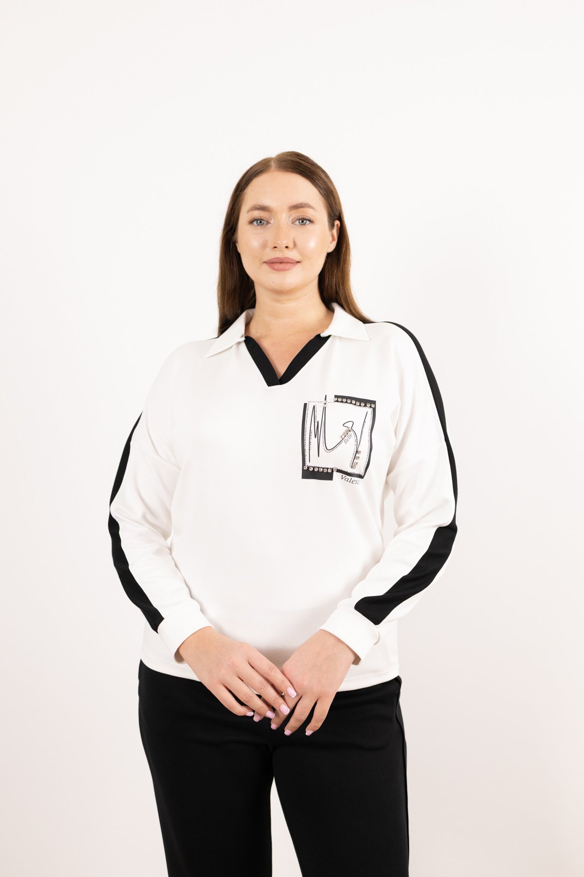 Polo Yaka Detaylı Taş Ve Yazı Detaylı Bluz