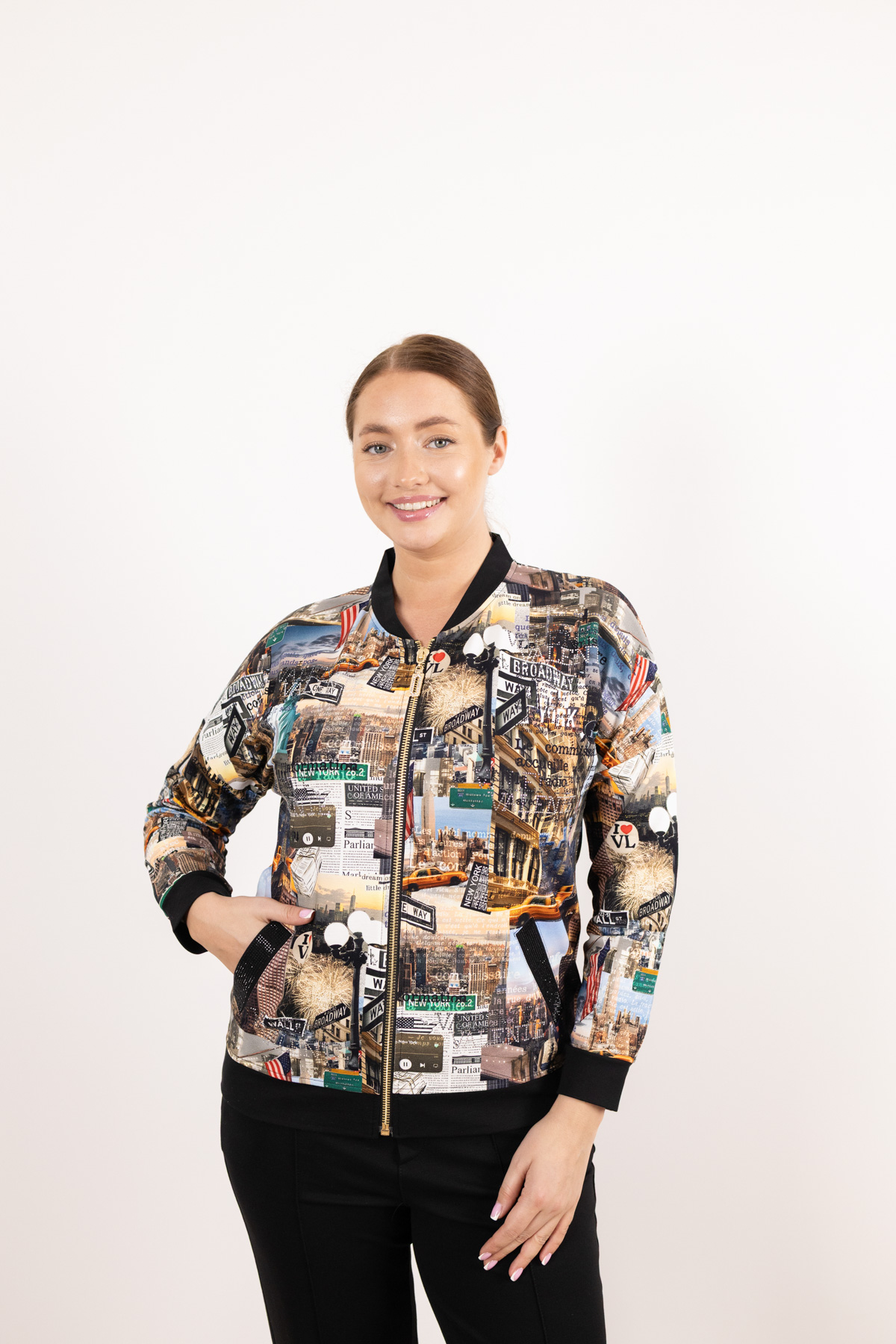 Şehir Baskı Detaylı Fermuarlı Uzun Kollu Hırka