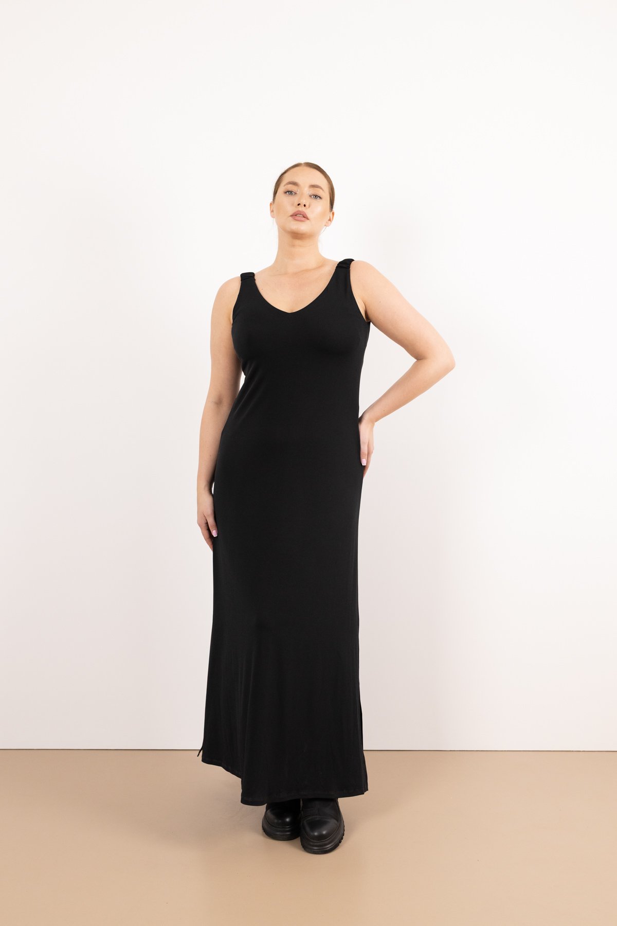 V Yaka Askı Büzğü Detaylı Sıfır Kollu Elbise