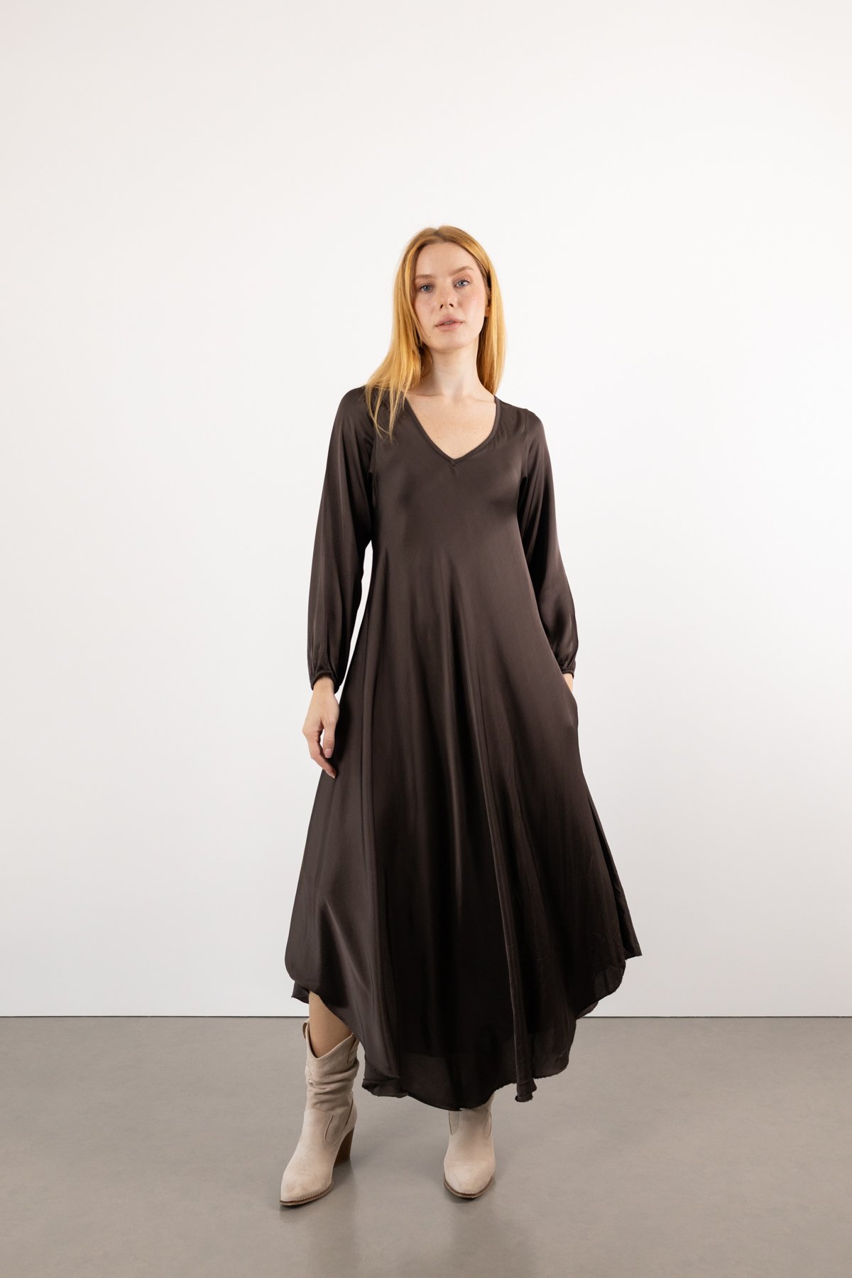 V Yaka Detay Uzun Kollu Saten Elbise (17K6ELB0231105)