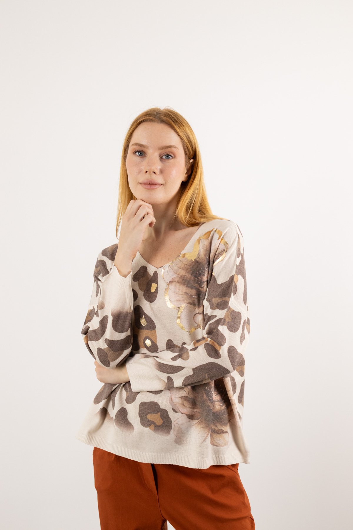 V Yaka Detaylı Gül Baskı Desenli Kazak