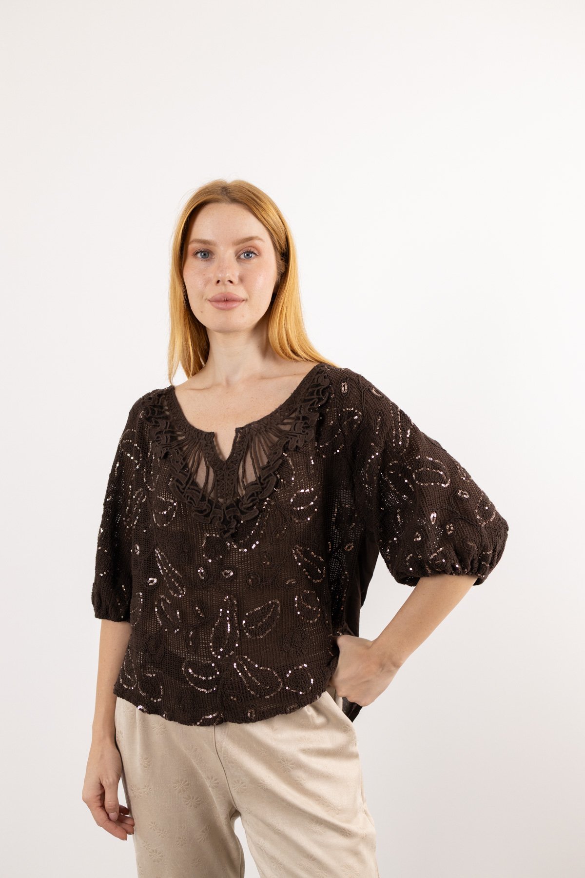 Yaka Örme Detaylı Pul Payet Baskılı Kolları Büzgülü Bluz