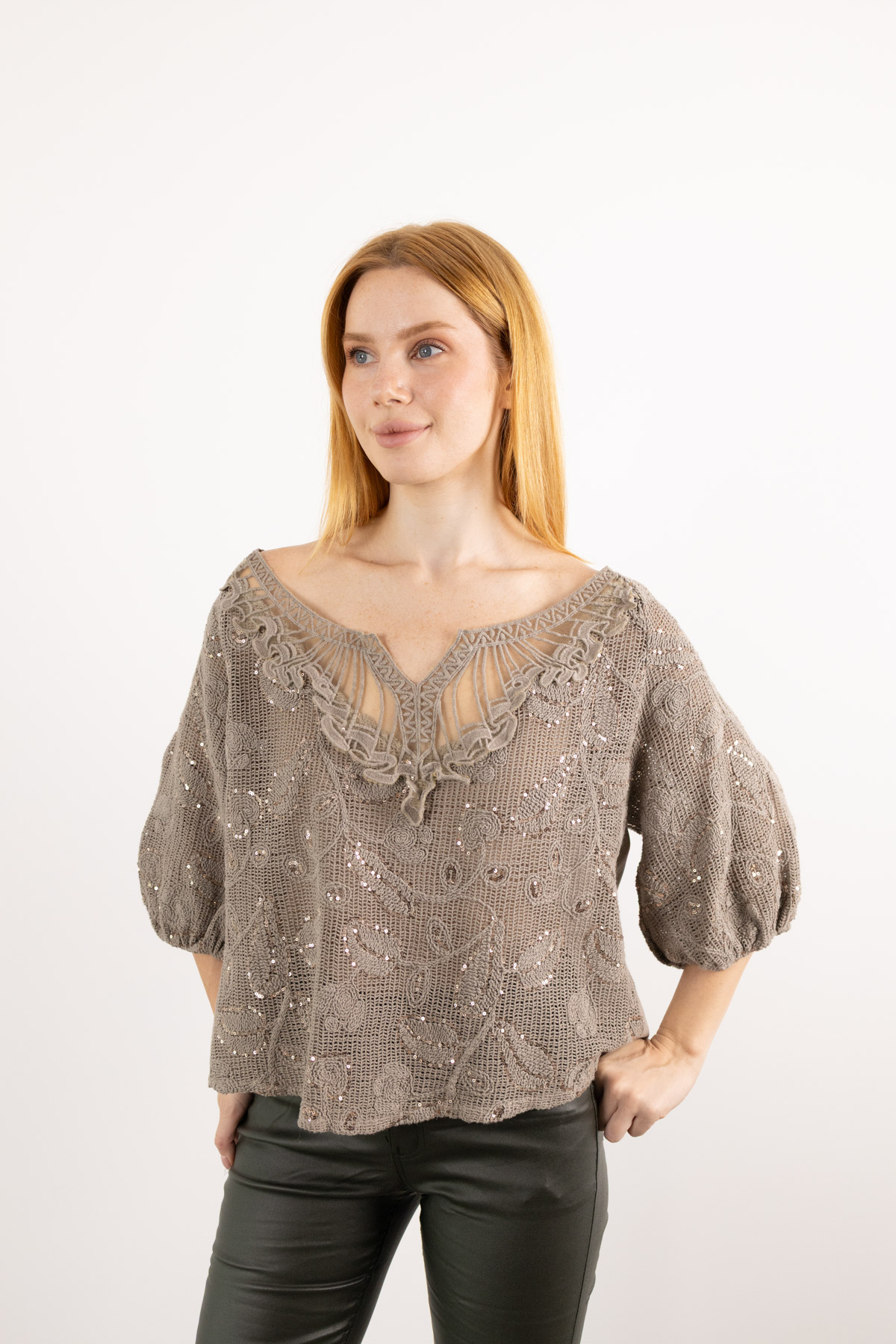 Yaka Örme Detaylı Pul Payet Baskılı Kolları Büzgülü Bluz