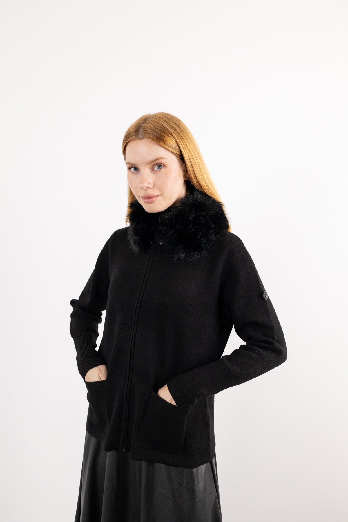 Yaka Pelüş Detaylı Cepli Fermuarlı Uzun Kollu Hırka