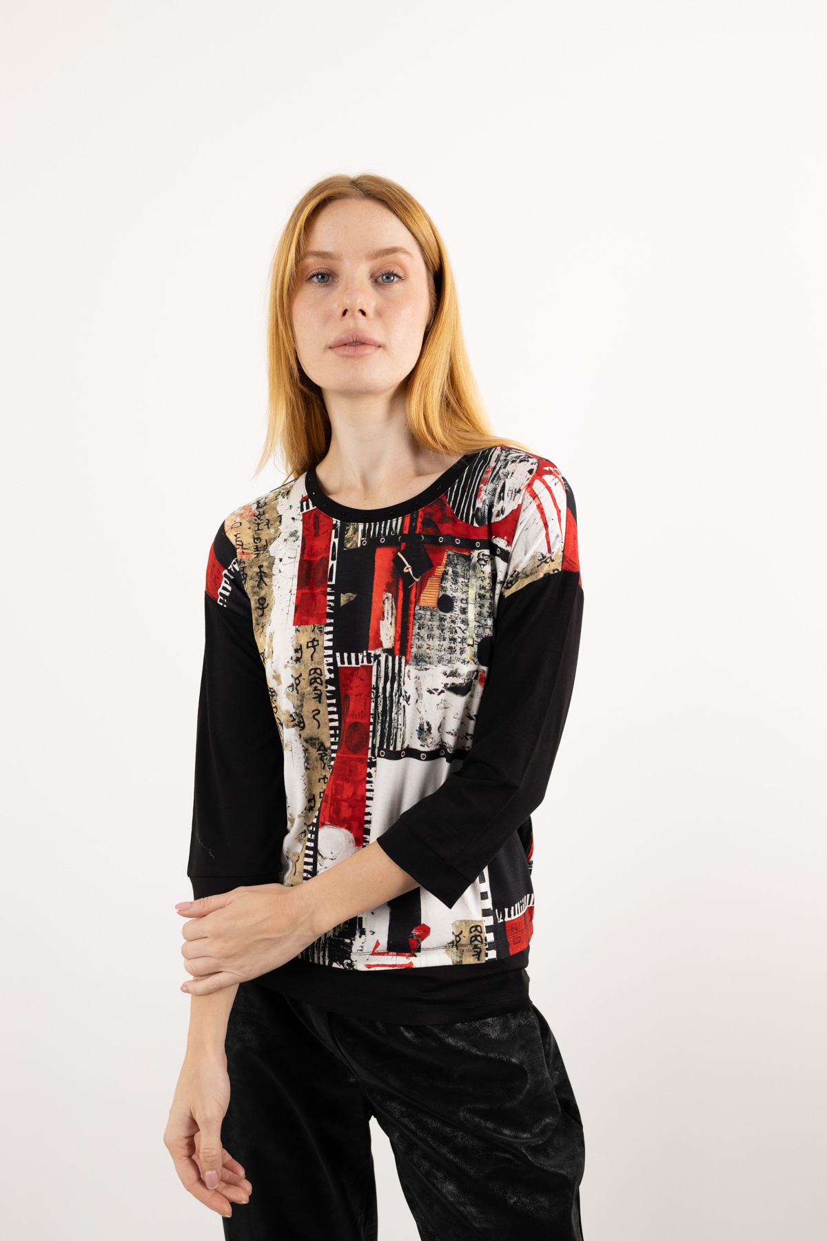Yaka Taş Baskı Ve Yazı Desenli Örme Bluz